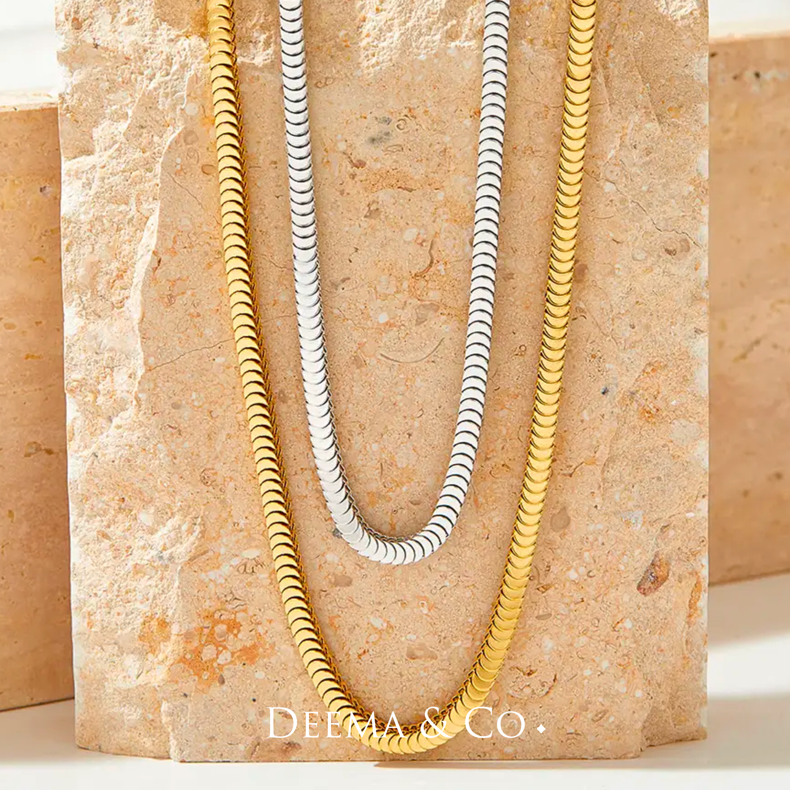 The Snaca Scale Necklace is a captivating and nature-inspired piece of jewellery that adds a touch of whimsy and elegance to your look. This necklace features a design inspired by snake scales, creating a unique and eye-catching aesthetic. Crafted with attention to detail, the Snaca Scale Necklace is made from high-quality grade Stainless Steel with rhodium or gold-plated brass. The scales are intricately textured, giving them a lifelike and three-dimensional appearance that mimics the beauty of nature.